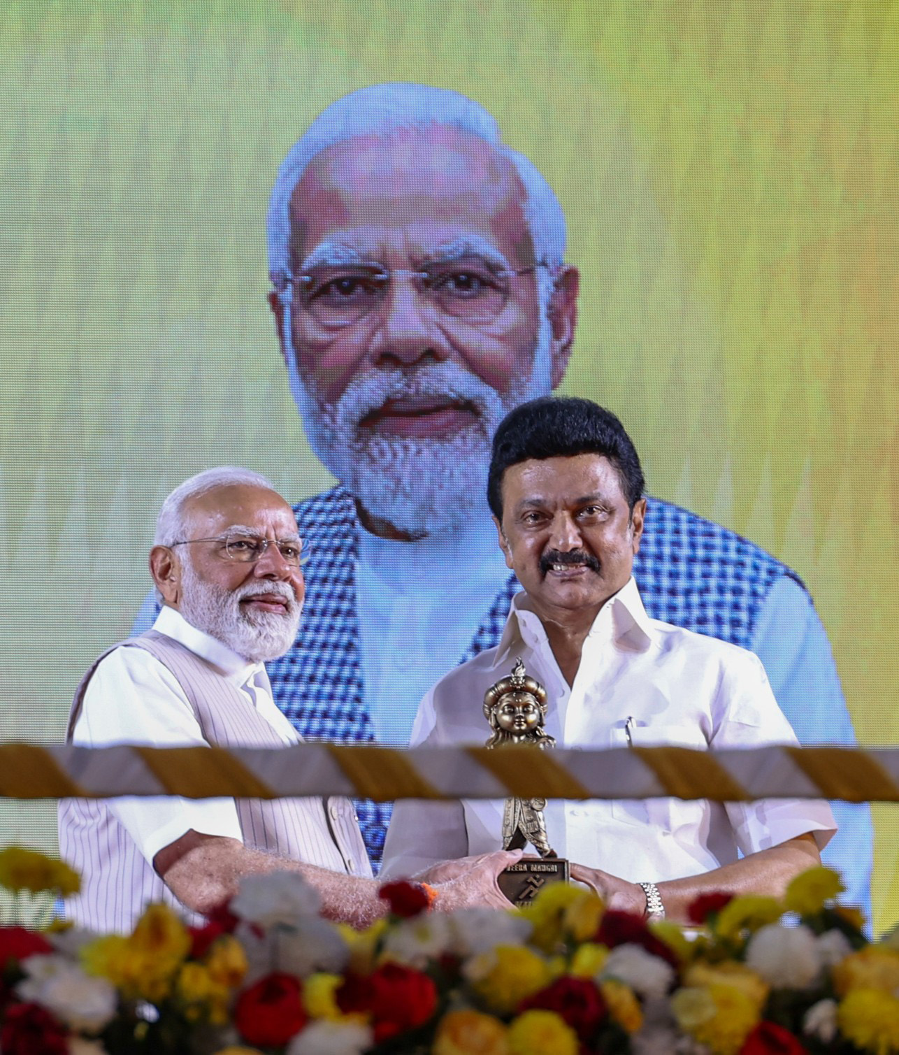 அப்போது விழாவில் பிரதமர் மோடிக்கு வீரமங்கை சிலையை நினைவுப் பரிசாக முதல்வர் ஸ்டாலின் வழங்கினார்.