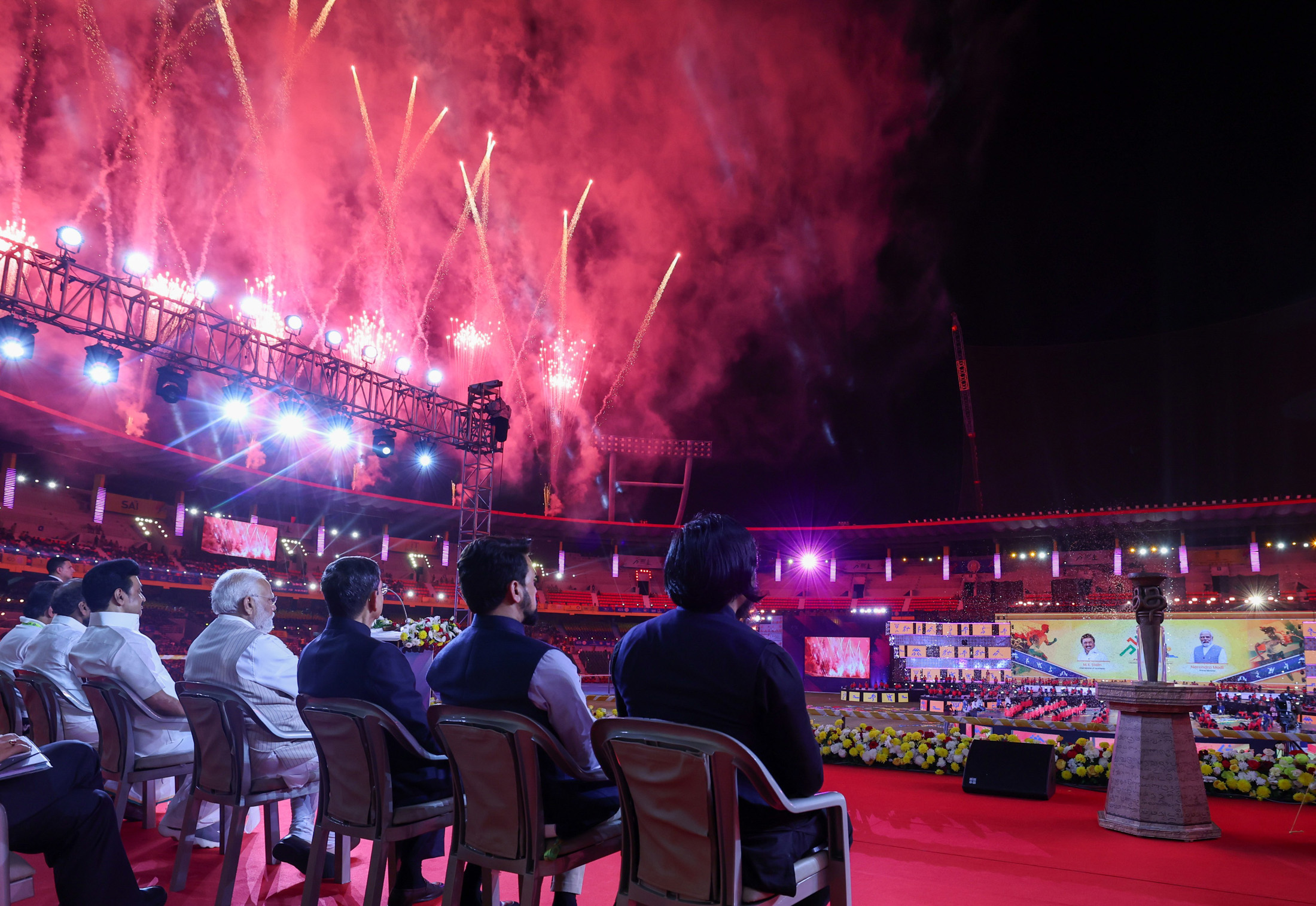 இன்று மாலை சென்னை நேரு உள் விளையாட்டரங்கில் நடைபெற்ற கேலோ இந்தியா போட்டிகளின் தொடக்க விழாவில் பிரதமர் மோடி, தமிழக ஆளுநர் ஆர்.என்.ரவி, முதல்வர் மு.க.ஸ்டாலின், மத்திய இளைஞர் நலன் மற்றும் விளையாட்டுத் துறை அமைச்சர் அனுராக்சிங் தாகூர், மத்திய இணை அமைச்சர்கள் நிஷித் பிராமானிக், எல்.முருகன், இளைஞர் நலன் மற்றும் விளையாட்டுத்துறை அமைச்சர் உதயநிதி ஸ்டாலின் ஆகியோர் கலந்து கொண்டனர்.